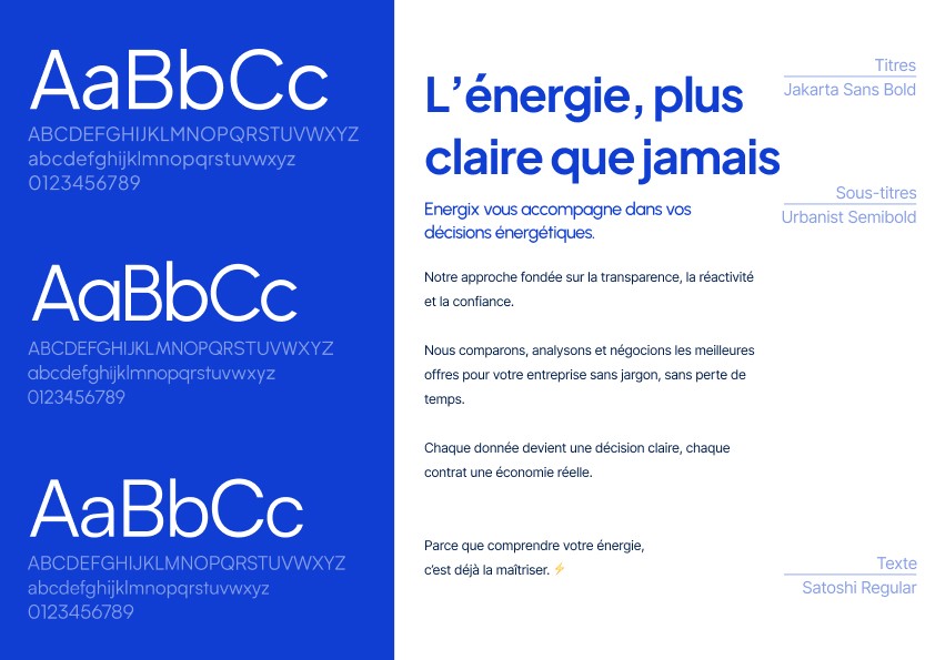 Energix ne vend pas un discours, mais des décisions éclairées. L’identité visuelle devait donc fonctionner aussi bien sur des supports digitaux que sur des supports plus institutionnels, capables de rassurer un dirigeant ou un responsable financier dès le premier contact. Typographie, mise en page et traitement des visuels ont été pensés pour : - faciliter la lecture - éviter toute surcharge d’information - installer une relation de confiance immédiate L’objectif n’est pas d’impressionner, mais de rendre compréhensible.