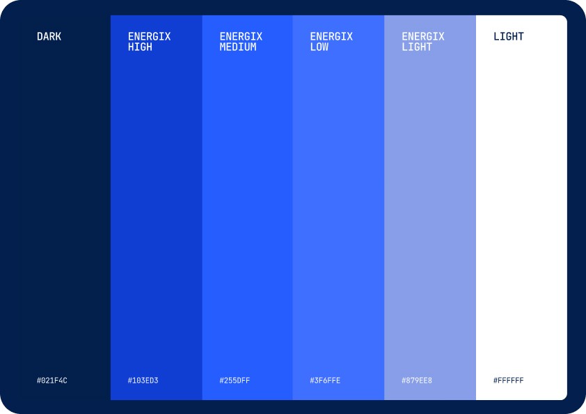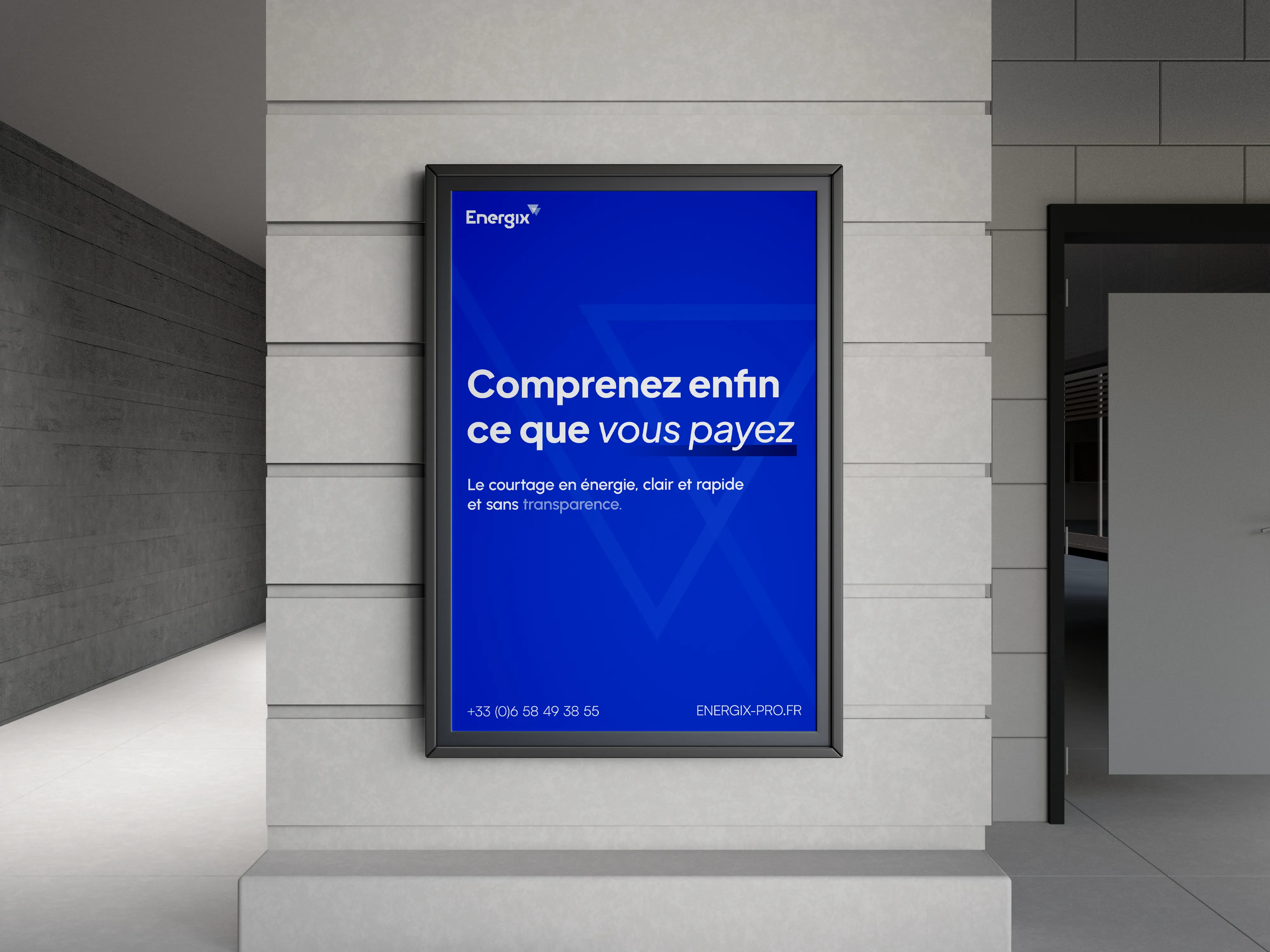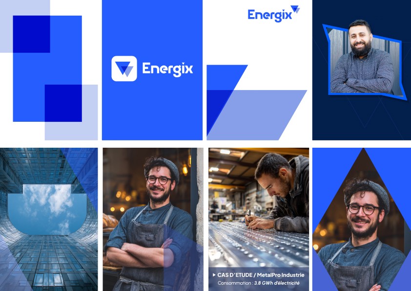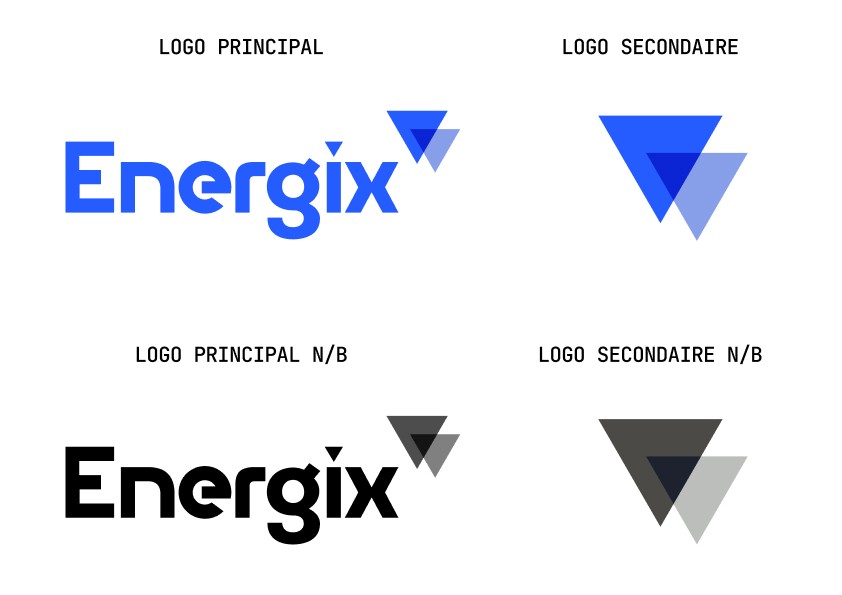 Le travail graphique s’est construit autour d’un objectif central : rendre visible ce que fait Energix au quotidien, à savoir simplifier, analyser et éclairer la prise de décision. Le choix des formes géométriques, et notamment du symbole triangulaire, évoque la stabilité, la maîtrise et la structuration de l’information. Rien n’est décoratif. Chaque élément sert un message précis : ici, l’énergie devient compréhensible. La palette de bleus renforce cette lecture. Elle installe un climat de sécurité et de fiabilité, tout en suggérant une expertise technique maîtrisée. Les déclinaisons de tons permettent de hiérarchiser l’information, comme Energix hiérarchise les données énergétiques pour ses clients.